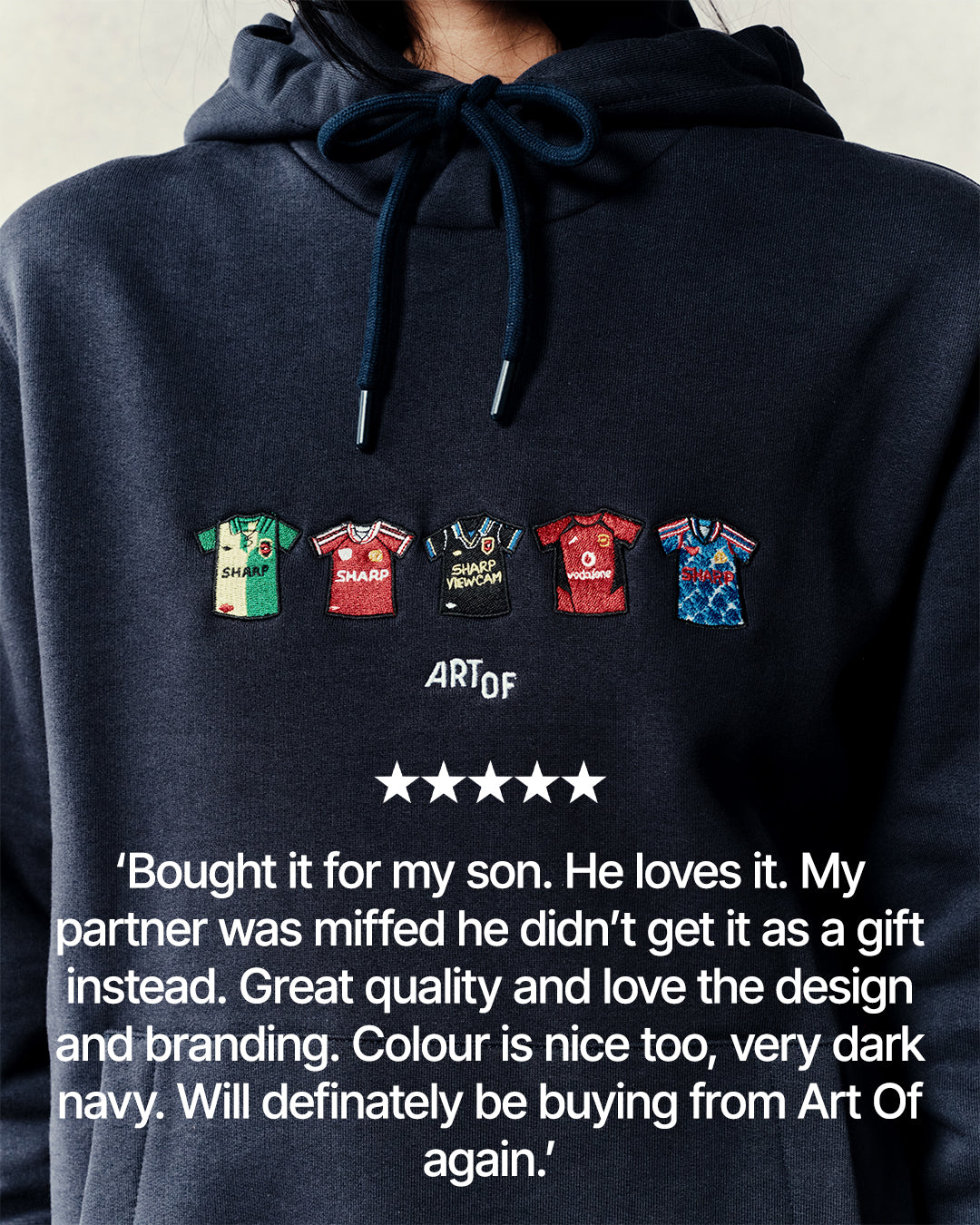 Graphic Design: A collection of classic football shirts. The fabric of football history. Over 25,000 stitches, 30 minutes of embroidery.